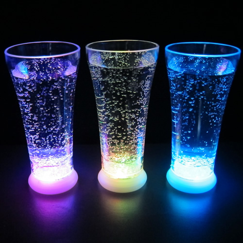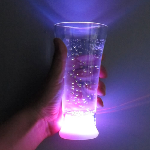 One of our most popular light up promotional products, the LED Light Up Fountain Glass (or Pilsner glass) is a great way to light up any event. The Custom Printed Light Up Fountain Glass has three bright LED lights in its base - one blue, one green and one red - which can bet set to 8 different color and light patterns, including a color changing "rainbow" mode.