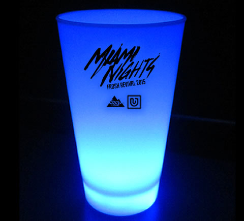 Promotional Printed Glowing Party Cups come with eight different color and light settings all in one cool glowing drink cup! Have your company brand, logo or personal message printed right on these super bright and fun LED Light Up Party Cups. Turn the custom printed party cup on by pressing the button on the bottom of the glow cup, keep pressing the button to circulate through the various color and light modes.